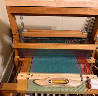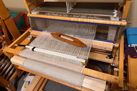 LeClerc Voyageur: I am still trying to finish a linen scarf for Jean-Jacques; this project has been slow going, probably because it's a table loom and the pattern is complex (coffee beans). During the upcoming break I hope to make significant progress on it.