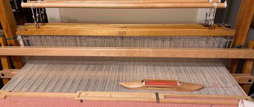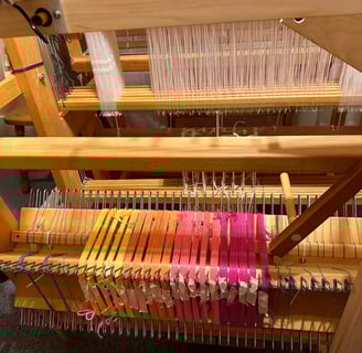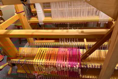 Oxaback Lilla: Over the summer I managed to snag a used sectional warp beam from Ravelry (an online fiber arts community) and Jean-Jacques helped me install it. This is my first sectional warp so it's a steep learning curve, but I'm hoping it will eventually make the warping process easier. The plan is to make a set of towels based on the colors for a Jane Stafford online guild project and I think the warp is about 3 yards long.